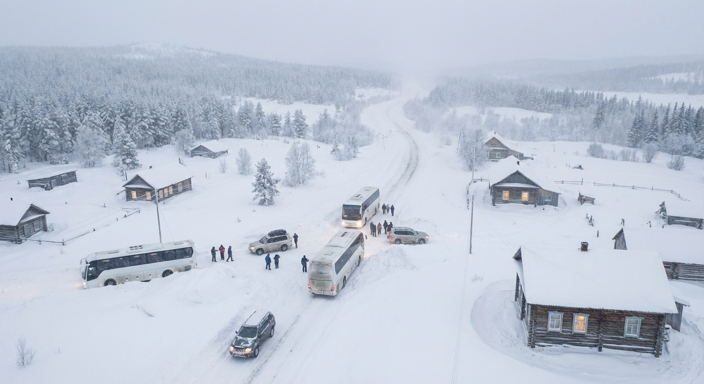 16 февраля 2026 Сильная метель в Мурманской области на двое суток заблокировала дорогу в арктический поселок Териберка. Сотни машин и автобусов с туристами, включая группы из Китая, не могли ни выехать, ни въехать в село. Местные власти организовали для застрявших людей пункты временного размещения, где путешественники из разных стран коротали время совместным исполнением